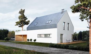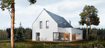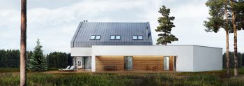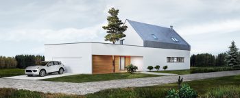 Dom jest wyraźnie podzielony na część mieszkalną z dachem dwuspadowym oraz część garażowo – gospodarczą z dachem płaskim. Charakterystycznym elementem budynku jest wjazd do garażu zlokalizowany w ściętym narożniku działki, dzięki czemu elewacja frontowa została oczyszczona z bramy garażowej, a jej główną dekoracją jest zagłębienie wykończone deską elewacyjną. W tym miejscu przewidzieliśmy również otwór w nadwieszonym stropie na drzewo. Elewacja ogrodowa została potraktowana podobnym kluczem jak frontowa i w części zadaszonej tarasu zastosowaliśmy również deskę elewacyjną, przełamując tym samym klasyczną bryłę domu z dwuspadowym dachem.
