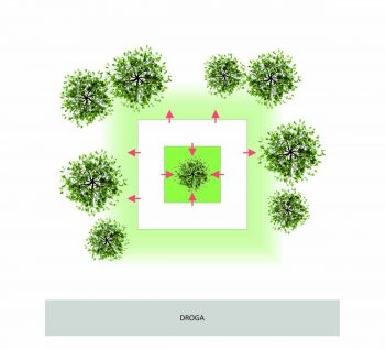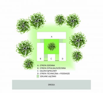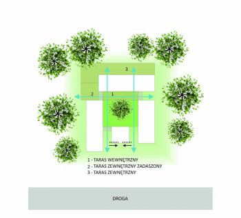 Strefa dzienna otwiera się zarówno na wewnętrzny jaki i na zewnętrzny ogród, umożliwiając obcowanie z przyrodą w każdym miejscu. Staraliśmy się tak zaprojektować przeszklenia w domu, aby w kilku miejscach możliwe były widoki na przestrzał całego budynku, nadające bryle transparentność i lekkość. Mając na uwadze pory dnia i roku zaprojektowaliśmy trzy tarasy wychodzące na różne strony świata: jeden wewnętrzny od południowo-wschodniej strony, drugi zewnętrzny przykryty dachem wychodzący na zachód oraz zewnętrzny otwarty o orientacji północno-zachodniej.