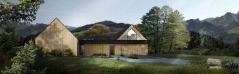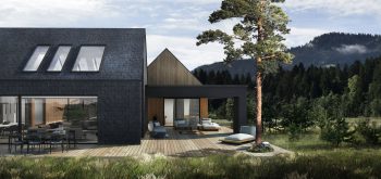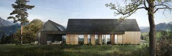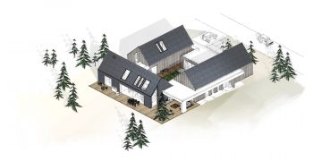 Trzy z nich mają podobną kubaturę, są przekryte dachami dwuspadowymi i mieszczą funkcję dzienną, sypialną/gościnną oraz techniczną z użytkowym poddaszem, gdzie zlokalizowana została przeszklona sala do jogi.