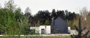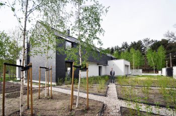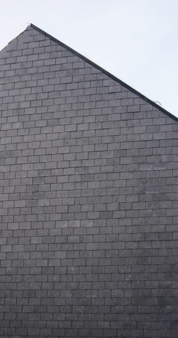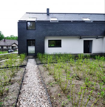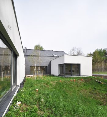 Bryła budynku składa się z dwóch elementów – głównej części o archetypowym kształcie wiejskiego domu z dachem spadzistym oraz dostawionych do niej nowoczesnych prostych brył z dachami płaskimi. Aby podkreślić wagę części z dachem spadzistym, zaproponowaliśmy użycie tego samego materiału na pokrycie dachu oraz elewacji w postaci grafitowego łupka. Piękno tego materiału tkwi w jego naturalnym charakterze, fakturze, głębi koloru, który potrafi się zmieniać w zależności od pór roku, warunków klimatycznych oraz nasłonecznienia. Dzięki zastosowaniu tego samego materiału na dachach i elewacji mogliśmy całkowicie zrezygnować z okapów i rynien, upraszczając kształt budynku do maksimum.