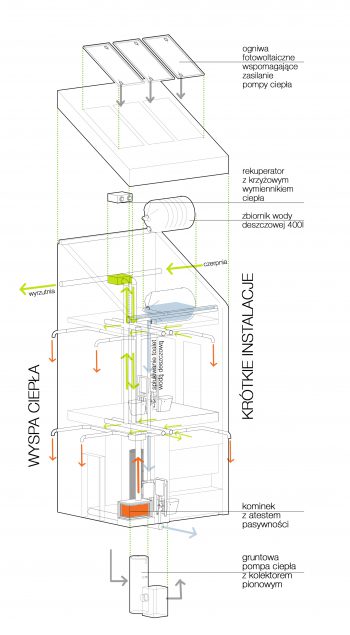 Tak właśnie powstała idea rdzenia, jako centralnego punktu domu, mieszczącego wszystkie systemy oraz instalacje niezbędne do obsługi ekologicznego budynku. Proponowane rozwiązanie jest częściowo systemowe, ponieważ rdzeń jest elementem stałym i powtarzalnym, natomiast okalająca go architektura, może nabierać różnych kształtów i rozmiarów w zależności od lokalizacji budynku na działce, stron świata, potrzeb funkcjonalnych przyszłych domowników, a także względów estetycznych.