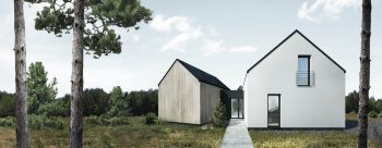 Wjazd do garażu został zlokalizowaliśmy na elewacji północnej, ponieważ nie chcieliśmy zaburzać prostoty elewacji frontowej. Tam też powstał wewnętrzny plac łączący wjazd na działkę, do garażu i do budynku gospodarczego.