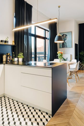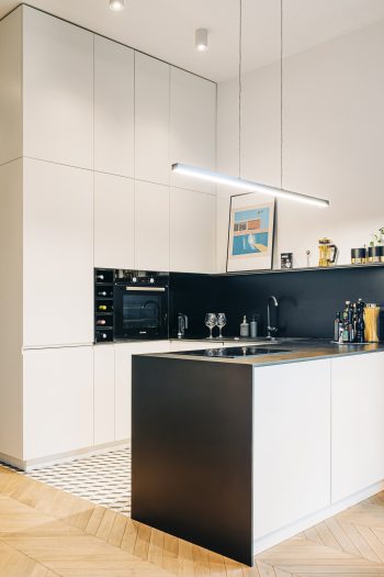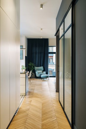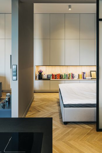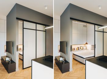 Zastosowaliśmy kilka sprytnych rozwiązań, jak sypialnia ukryta za przesuwnymi drzwiami, ciągi zabudowanych szaf kryjących domowy bałagan, a także biurko ukryte w szafie.