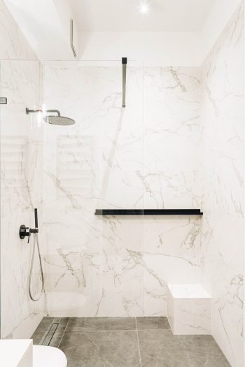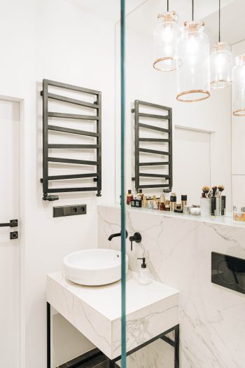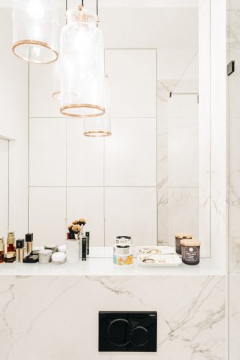 Przestronna łazienka została zaprojektowana jako elegancki salon kąpielowy, w którego wnętrzu ukryliśmy dużą szafę mieszczącą pralkę, suszarkę i sprzęt AGD. Prawda, że nic nie widać?