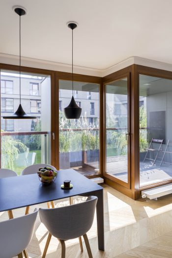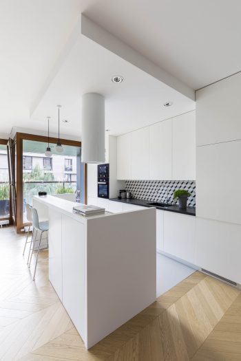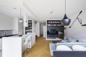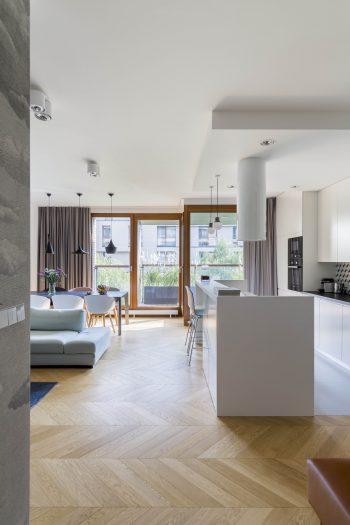 Wnętrze mieszkania jest bardzo jasne, ponieważ zależało nam na zachowaniu białych ścian, które stałyby się tłem dla pięknych mebli, lamp i dodatków. Drewniany parkiet ułożony w jodłę francuską podkreśla elegancki charakter wnętrza i bardzo ociepla klimat domu.