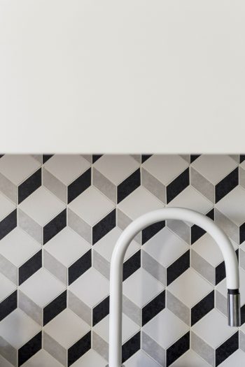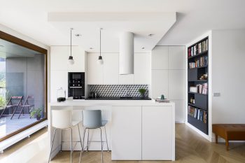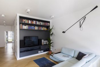 Cała strefa dzienna została zlokalizowana w jednej otwartej przestrzeni. Dużą część zajmuje tutaj kuchnia, która stanowi serce domu z uwagi na kulinarną pasję domowników. Ze względu na jej rozmiar, chcieliśmy żeby była biała i prosta, nie zwracająca na siebie zbyt wiele uwagi. Jedynie charakterystyczne płytki na ścianie wprowadzają widoczny z każdego miejsca detal. Klamrą spajająca kuchnię z salonem, jest podzielony na dwie części czarny regał na książki i tv. Bardzo spodobała nam się idea wprowadzenia książek do kuchni i przełamania sterylności tego miejsca.