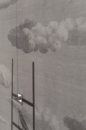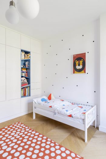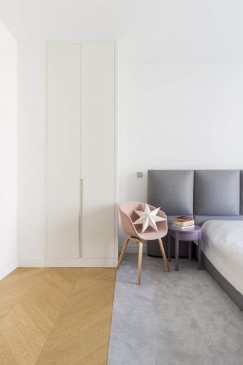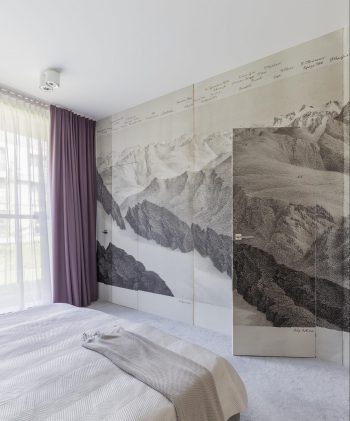 Kolejnym akcentem zmiękczającym wnętrze są piękne i bardzo efektowne tapety firmy Wall & Decò. Zastosowaliśmy je w dwóch miejscach: naprzeciw wejścia do mieszkania, ukrywając tym samym drzwi do pralni oraz w sypialni, na ścianie naprzeciw łóżka mieszczącej dwoje drzwi do garderób.