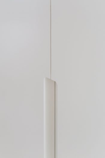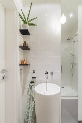 W drugiej, mniejszej łazience również postawiliśmy na prostotę, przełamaną delikatnym dekorem z płytek i kolorowych dodatków. Eleganckiego charakteru dodają wertykalne elementy takie jak wolnostojąca umywalka, wąskie pionowe lustro obok umywalki czy biała szafa w zabudowie.