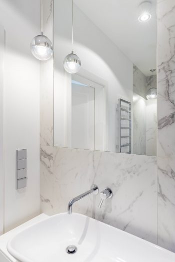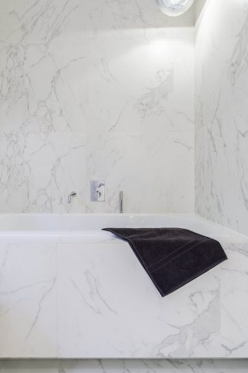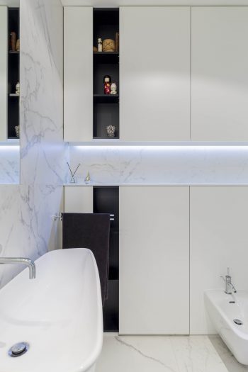 W mieszkaniu znajdują się dwie łazienki, którym chcieliśmy nadać odmienny charakter. Większą potraktowaliśmy jak elegancki salon kąpielowy, z dominującym marmurem. Jedynym dodatkiem są proste, wysokie szafkami przełamane czarnym rozcięciem i elegancka armatura i ceramika.